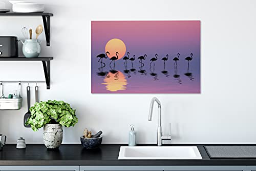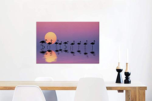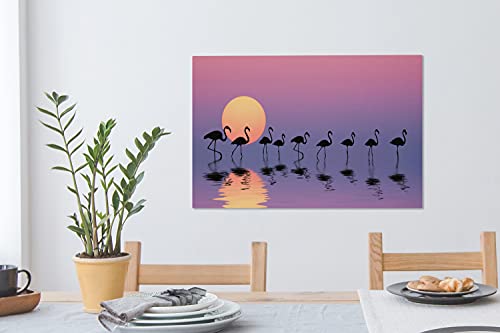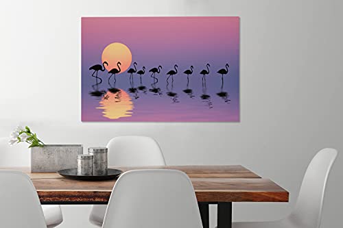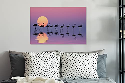 Weergave van een groep flamingo’s lopend door het water, op de voorgrond is hun reflectie te zien. De zon gaat onder en kleurt de lucht roze.Dit prachtige canvas schilderij is bijvoorbeeld perfect voor in de woonkamer of slaapkamer!