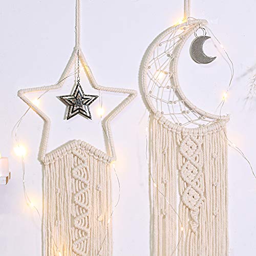 2 STKS Macrame Muur Opknoping Ster Maan Dream Catcher Tapestry Bohemian Home Decor Handgemaakte Geweven Decoratie voor Kids Kamer Thuis Bruiloft Ornament Craft Gift (Beige)