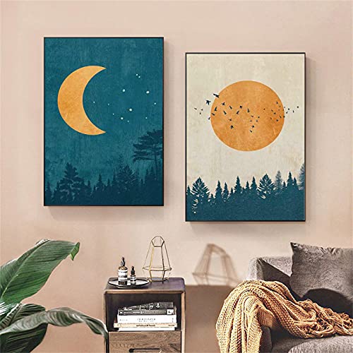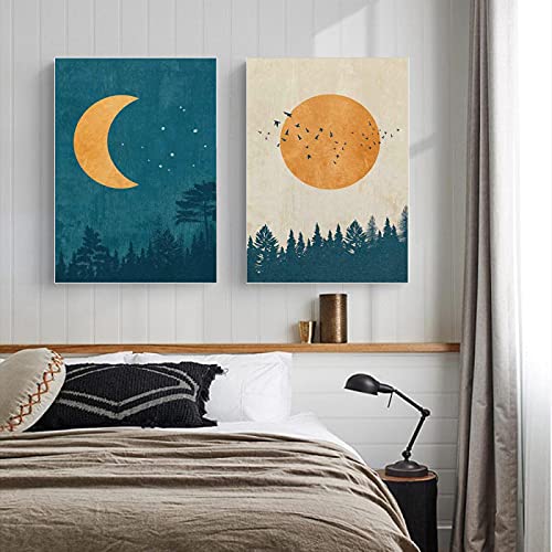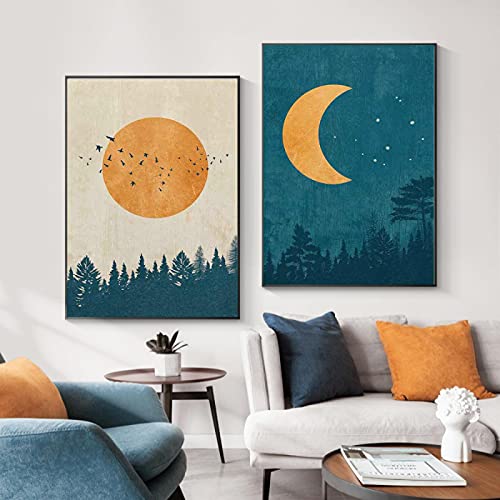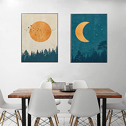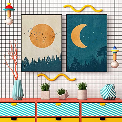 Abstracte Canvas Muur Art Set van 2 Geel Zon Maan Bos Esthetische Foto’s Kantoor Kunstwerk Muur Decor Woonkamer Moderne…